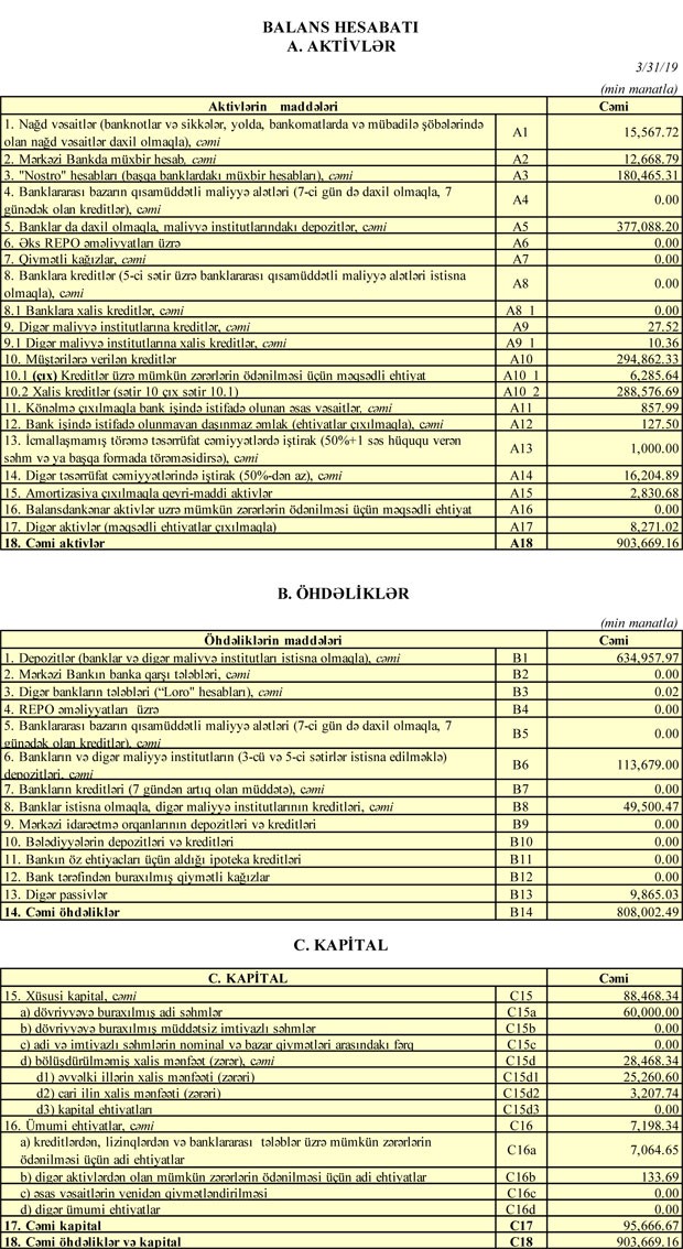 Müqayisə üçün qeyd edək ki, 2018-ci ilin 1-ci yrübündə “Azərbaycan Sənaye Bankı”nın cəmi gəlirləri 8 milyon 90 min manat, cəmi xərcləri 6 milyon 25 min manat, əməliyyat mənfəəti 2 milyon 64 min manat təşkil etmişdi. Bank əməliyyat mənfəətinin 375 min manatını ehtiyata ayırdığından həm dövrü 1 milyon 689 min manat xalis mənfəət ilə bağlamışdı.