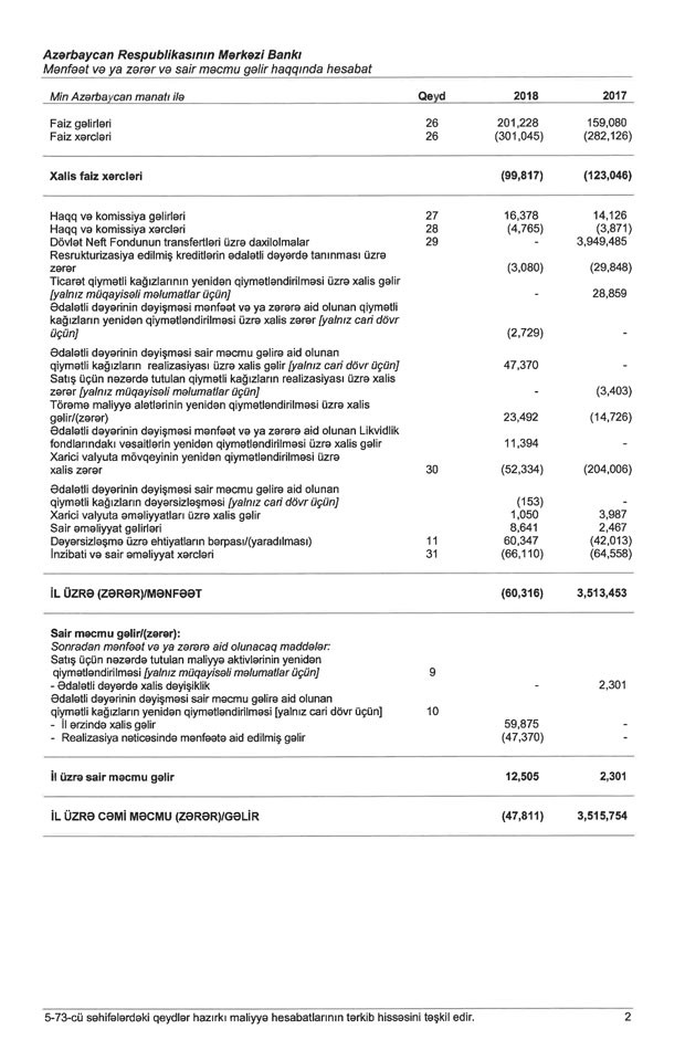 Mərkəzi Bank 2018-ci ili 60 milyon 316 min manat zərərlə başa vurub. Halbuki, qurum 2017-ci ildən 3 milyard 513 milyon manat mənfəətlə çıxmışdı. Bunun səbəbi Neft Fondundan 3 milyard 949 milyon manat transfertlər olmuşdu.