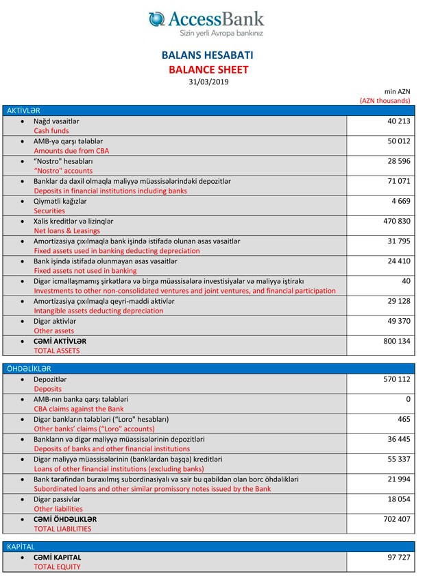 AccessBank 2019-cu ilin ilk rübünə dair maliyyə hesabatını açıqlayıb.