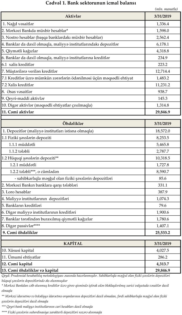 31 mart 2019-cu il tarixinə Azərbaycanda fəaliyyət göstərən bankların cəmi aktivləri 29 milyard 846.9 milyon manat, cəmi öhdəlikləri isə 25 milyard 533.2 milyon manat təşkil edib. Sektorun balans kapitalı 4 milyard 313.7 milyon manat olub.
