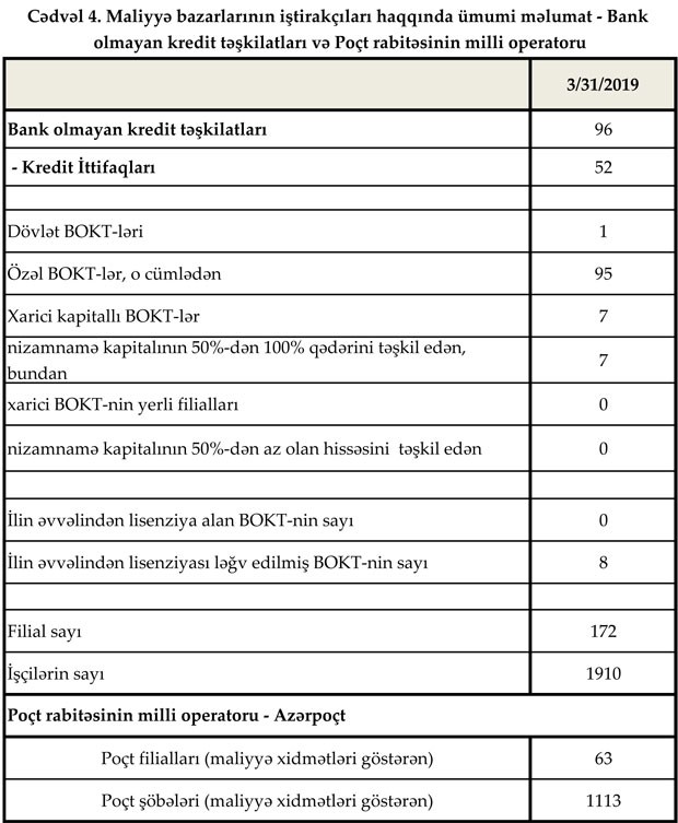 Fəaliyyət göstərən 30 bankın filiallarının sayı 512, şöbələrinin sayı 129, ATM-lərin sayı 2535 olub. Bank sektorunun işçi heyətinin sayında artım mart ayında da davam etmişdir. Belə ki, 2019-cu ilin mart ayında işçi sayı 0.4% (66 nəfər) artaraq 17 min 749 nəfər təşkil edib.