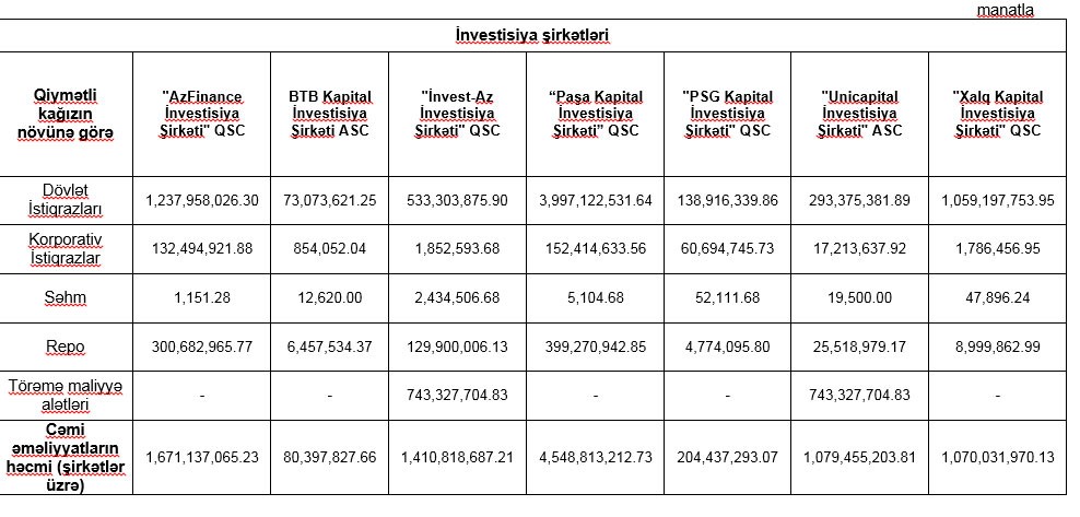 Birjadan "Marja"ya daxil olmuş məlumata görə, “PAŞA Kapital İnvestisiya Şirkəti” QSC 4 milyard 549 milyon manat dövriyyə ilə 1-ci, "AzFinance İnvestisiya Şirkəti" QSC 1 milyard 671 milyon manat dövriyyə ilə 2-ci, "İnvest-Az İnvestisiya Şirkəti" QSC 1 milyard 410 milyon manat dövriyyə ilə 3-cü, "Unicapital İnvestisiya Şirkəti" ASC 1 milyard 79 milyon manat dövriyyə ilə 4-cü, "Xalq Kapital İnvestisiya Şirkəti" QSC 1 milyard 70 milyon manat dövriyyə ilə 5-ci olub.