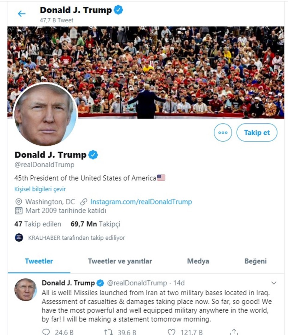 "Marja" xəbər verir ki, ABŞ Prezidenti, "Hər şey yolundadır! İraqdakı iki hərbi bazamıza İrandan raketlər atıldı. İtkin və ziyanları qiymətləndiririk. Dünyanın ən güclü və ən təchizatlı ordusu bizdədir. Sabah səhər bir açıqlama da edəcəyəm" deyib.