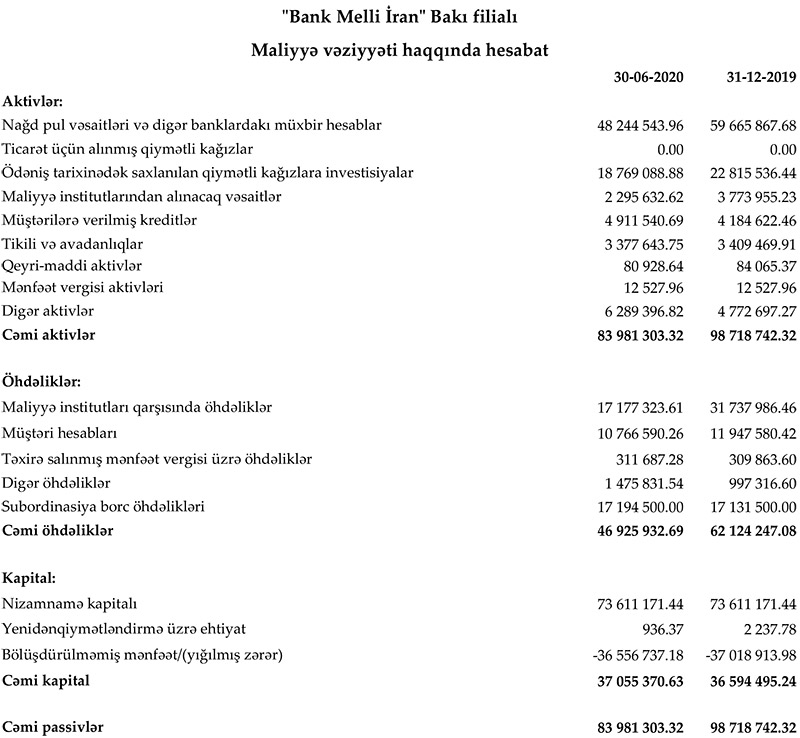 Bank Melli İran Bakı filialı 2020-ci ilin 1-ci yarısında kiçilib.
