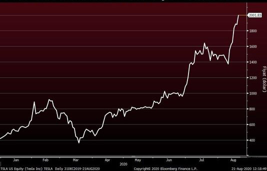 Elektrikli avtomobil istehsalçısı Teslanın səhmləri Mart ayında 350 dollara qədər düşməsinin ardından beş aylıq güclü yüksəlişilə Cümə axşamı günü 2 min dolları aşıb.