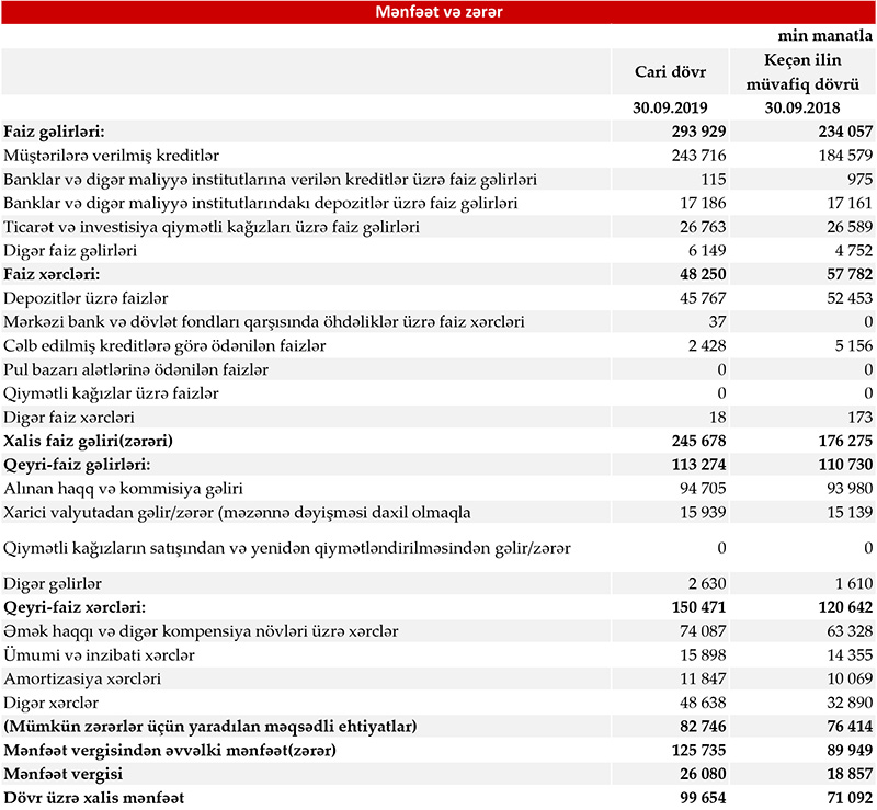 Xatırladaq ki, 2019-cu ilin 9 ayında Kapital Bankın cəmi əməliyyat gəlirləri 407 milyon 203 min manat, cəmi əməliyyat xərcləri 198 milyon 721 min manat təşkil etmiş, gəlirlər xərcləri üstələdiyindən 208 milyon 482 min manat əməliyyat mənfəəti yaranmışdı. Həmin dövrdə əməliyyat mənfəətindən 82 milyon 746 min manatı mümkün zərərlər üçün yaradılan məqsədli ehtiyatlara ayırılmış, 26 milyon 80 min manat t mənfəət vergisi ödənilmişdi. Nəticədə Bank 99 milyon 654 min manat xalis mənfəət əldə etmişdi.