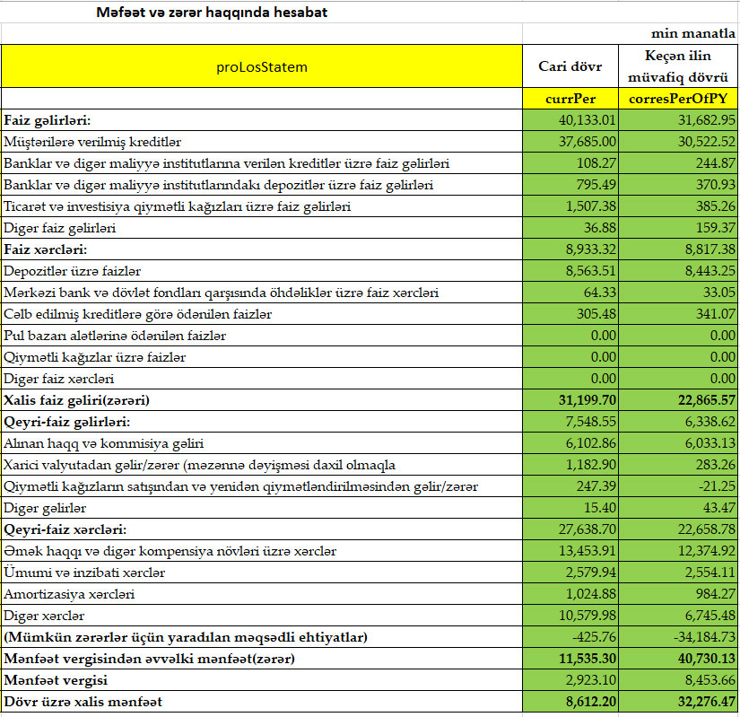 Müqayisə üçün qeyd edək ki, 2019-cu ilin 9 ayında Bak of Bakunun cəmi əməliyyat gəlirləri 38 milyon 21 min manat, cəmi əməliyyat xərcləri 31 milyon 475 min manat, əməliyyat mənfəəti 6 milyon 546 min manat təşkil etmişdi. Mümkün zərərlər üçün yaradılan məqsədli ehtiyatdan 34 milyon 184 min manat azad olmuş və mənfəət 40 milyon 730 min manata yüksəlmişdi. Bank of Baku 8 milyon 454 min manat mənfəət vergisi ödədiyindən həmin dövrü 32 milyon 276 min manat xalis mənfəət ilə bağlamışdı.