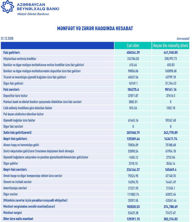 Ötən illə müqayisədə Bankın xalis mənfəətinin azalması, əsasən, əsas bank fəaliyyəti ilə bağlı olmayan birdəfəlik gəlir və xərclərlə bağlıdır. Belə ki, əsas fərqlər maliyyə hesabatlarında “digər gəlirlər” və “digər xərclər” adları ilə əks olunub. Həmçinin bu, mümkün zərərlər üçün yaradılan məqsədli ehtiyatlara ayırmanın artması ilə əlaqədardır. Məlumdur ki, ötən il pandemiya ilə əlaqədar məhdudiyyətlər (sərt karantin rejimləri), neft qiymətlərinin kəskin düşməsi, 2-ci Qarabağ müharibəsilə əlaqədar olaraq iqtisadi aktivlik zəifləyib və bu vəziyyət banklara da təsir edib. Bütün dünya, o cümlədən Azərbaycan iqtisadiyyatı üçün pis keçən ötən bir ildə Azərbaycan Beynəlxalq Bankı gəlirlərinin kəskin azalmamasına və xalis mənfəətə nail olub.