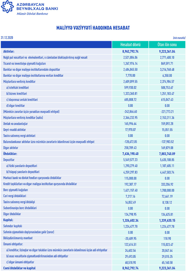 Banklar və digər maliyyə institutlarındakı depozitlərin və nağd pul vəsaitlərinin azalması ilə əlaqədar olaraq 2019-cu illə müqayisədə 2020-ci ildə “Azərbaycan Beynəlxalq Bankı”nın cəmi aktivləri 260 milyon 568 min manat azalaraq 8 milyard 962 milyon 793 min manata geriləyib. 2019-cu ilin sonunda Bankın cəmi aktivləri 9 milyard 223 milyon 361 min manata çatmışdı.