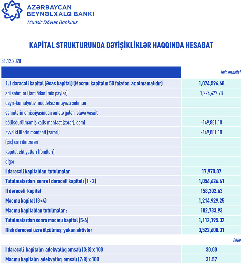 31 dekabr 2020-ci il tarixində Azərbaycan Beynəlxalq Bankı 1 milyard 326 milyon 602 min manat cəmi kapitala, o cümlədən 1 milyard 224 milyon 478 min manat səhmdar kapitalına malik olub. Bankın Kapital adekvatlığı əmsalı 32%-dən yüksək olmaqla minimum requlyativ tələbi 3 dəfəyə yaxın üstələyir.