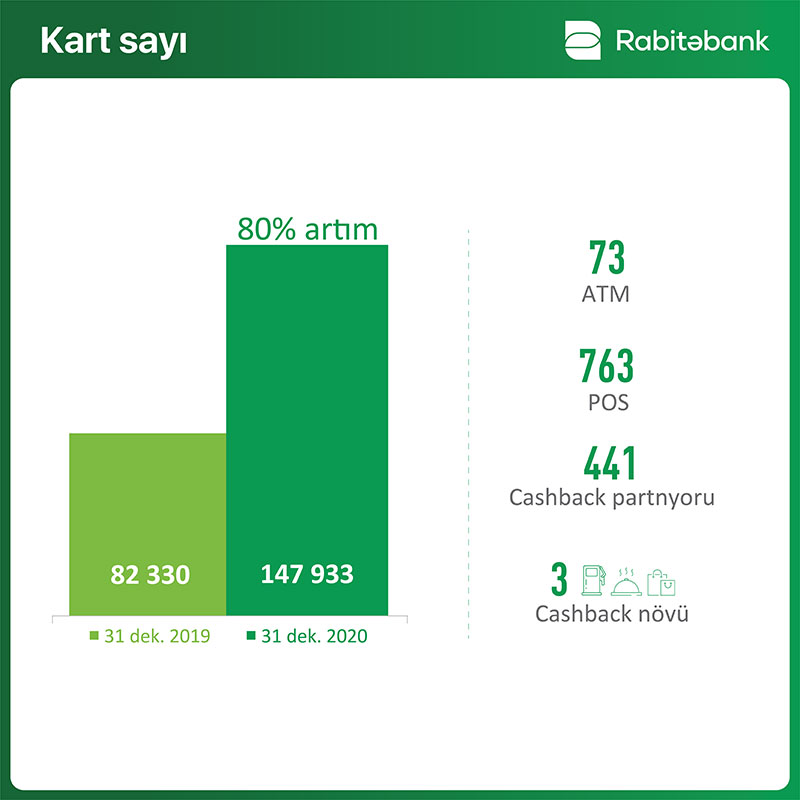 2020-ci il “Rabitəbank” ücün kart biznesi sahəsində də uğurlu il olmuşdur. Hesabat dövrü ərzində bank kart sayını 148 minə çatdırmışdır ki, bu da ötən il ilə müqayisədə 80% artım deməkdir. İstənilən kafe və restoran, supermarket, yanacaqdoldurma məntəqələri və bütün ödənişlərə keşbek seçimlərini özündə birləşdirən Kartmane kartı ilə yanaşı, bank müştərilərinə əməkhaqqı və kredit kartları məhsullarını təqdim edib. Bankın ödəniş qəbulu şəbəkəsi 763 POS-terminal, bankomat şəbəkəsi isə 73 ATM təşkil edir.