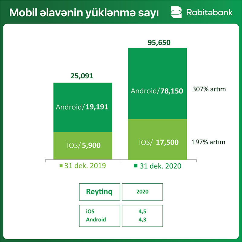 Bütün bank xidmətlərini sürətlə rəqamsal sferada da genişləndirən “Rabitəbank”ın mobil tətbiqi “Rabita Mobile”-ın yükləmələrinin sayı 3 dəfədən çox artaraq 95 560-a çatıb. “Rahat bankçılıq” sloqanına sadiq qalan “Rabitəbank”ın mobil tətbiqinin reytinqi 4,5 (iOS) və 4,3 (Android) bala yüksəlib.