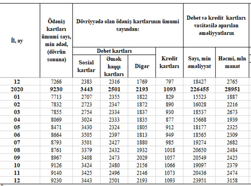 2020-ci il ərzində cəmi ödəniş kartlarının sayı 1 milyon 964 min ədəd artıb. 2019-cu ilin sonunda cəmi ödəniş kartlarının sayı 7 milyon 266 min ədəd təşkil etmişdi.