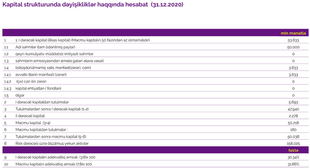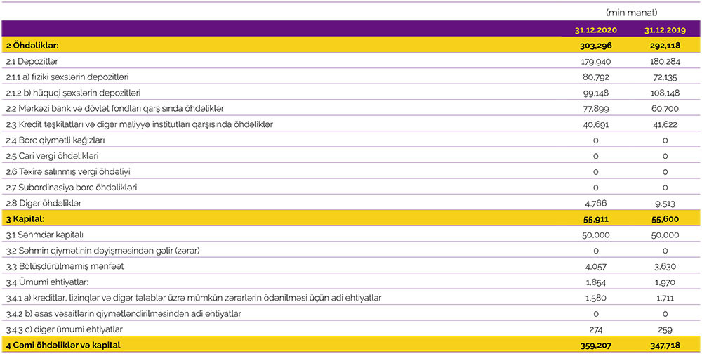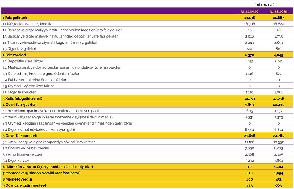 Bankın cəmi əməliyyat xərcləri (faiz və qeyri-faiz xərcləri) isə 2019-cu ildəki 29 milyon 634 min manatdan 2020-ci ildə 30 milyon 194 min manata yüksəlib. Gəlirlərin azalması və xərclərin artması ilə əlaqədar olaraq əməliyyat mənfəəti 2019-cu ildəki 2 milyon 548 min manatdan 2020-ci ildə 834 min manata düşüb. Bank ötən ilin 834 min manat əməliyyat mənfəətindən 10 min manat mümkün zərərlər üçün yaradılan xüsusi ehtiyatlara ayırıb və 400 min manat mənfəət vergisi ödəyib.