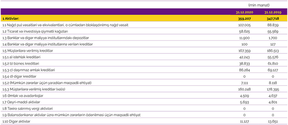2019-cu illə müqayisədə 2020-ci ildə “Azər-Türk Bank”ın cəmi aktivləri 11 milyon 489 min manat artaraq 359 milyon 207 min manata çatıb. Aktivlərin artmasının əsas səbəbi nağd pul vəsaitlərinin artması ilə əlaqədardır. 2020-ci ildə müştərilərə verilmiş cəmi kreditlər 19 milyon 154 min manat azalaraq ötən ilin sonunda 167 milyon 359 min manat olub. Ötən il Bankın daşınmaz əmlak kreditləri portfeli 17 milyon 157 min manat artaraq 86 milyon 284 min manata çatıb.