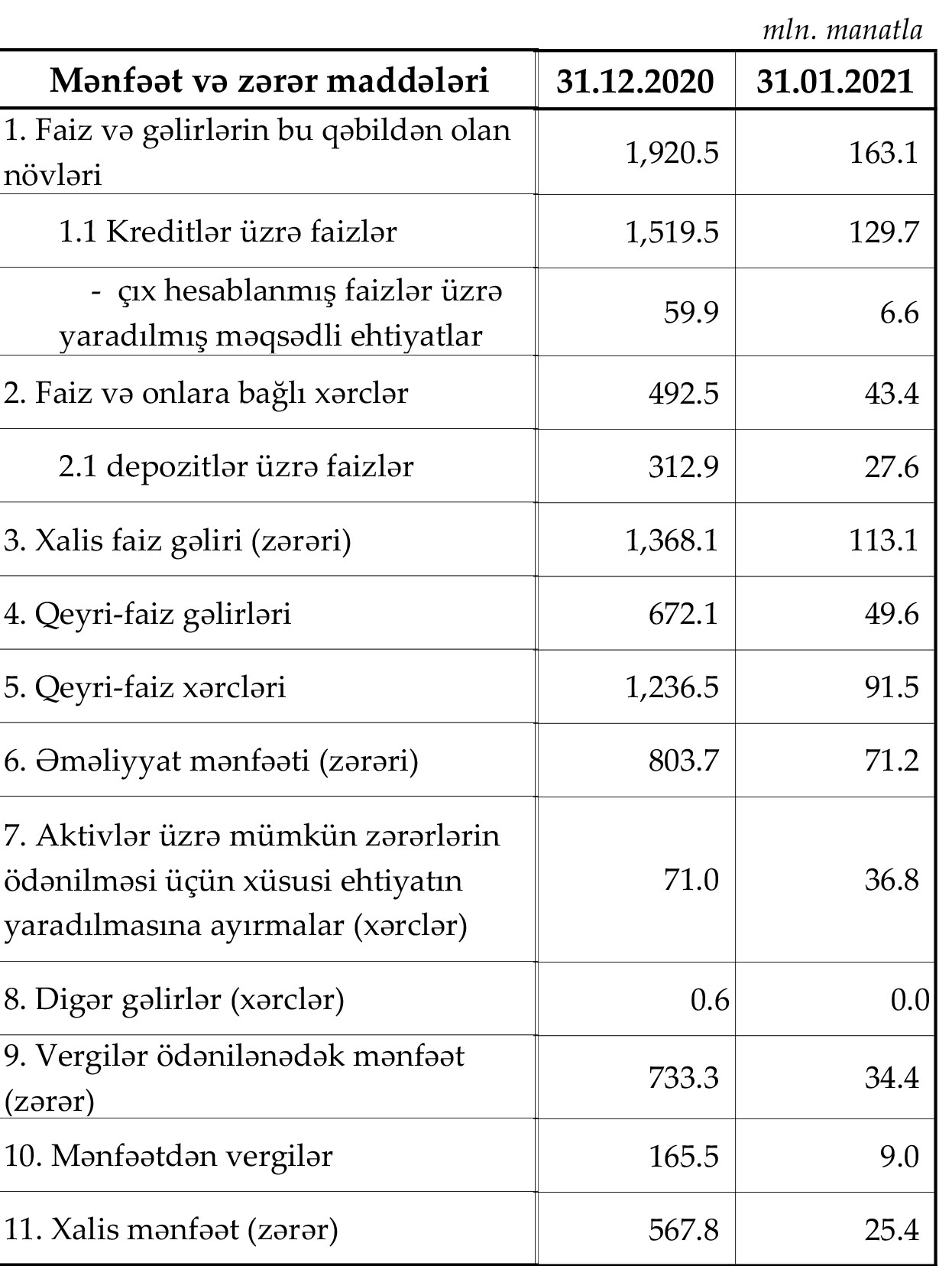 2021-ci ilin Yanvar ayı ərzində Azərbaycan banklarının (bank sektorunun) cəmi xalis mənfəəti 25,4 milyon manat təşkil edib.