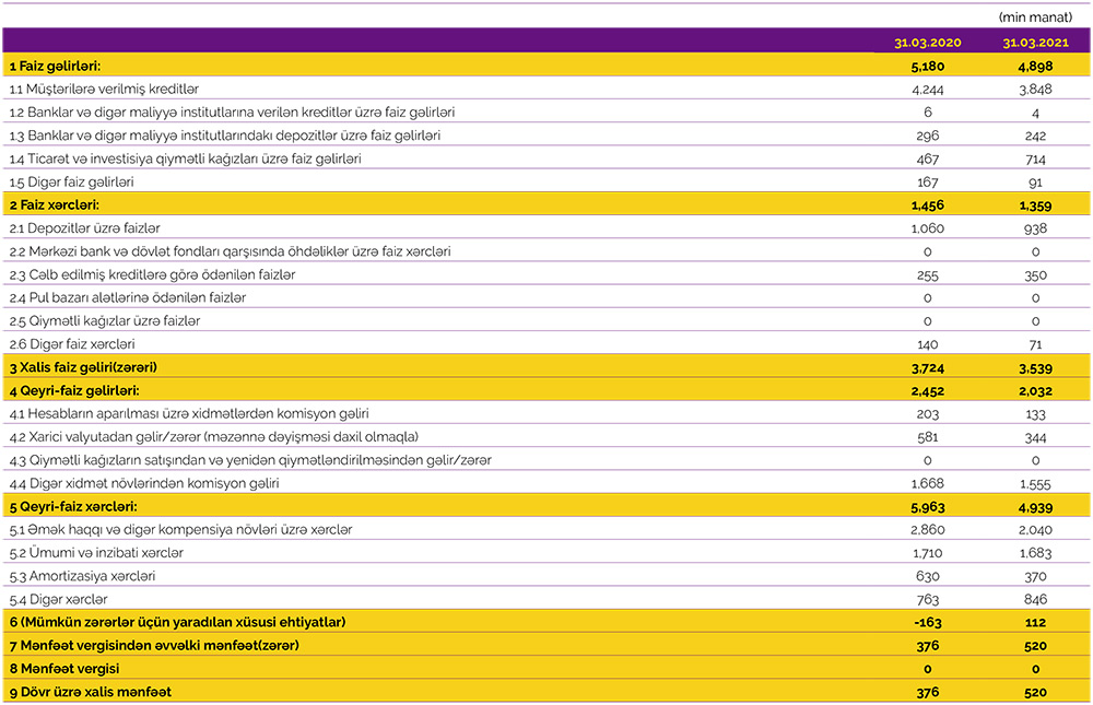 2021-ci ilinin 1-ci rübündə “Azər-Türk Bank” 632 min manat əməliyyat mənfəətindən mümkün zərərlər üçün yaradılan xüsusi ehtiyatlara 112 min manat ayırıb və nəticədə ilk rübü 520 min manat xalis mənfəət ilə başa vurub. “Azər-Türk Bank” 2020-ci ilin 1-ci rübündə 213 min manat əməliyyat mənfəətilə bərabər, 163 min manat mümkün zərərlər üçün yaradılan xüsusi ehtiyatlardan azad olmuş, beləliklə, Bank həmin rübü 376 min manat xalis mənfəət ilə bağlamışdı.