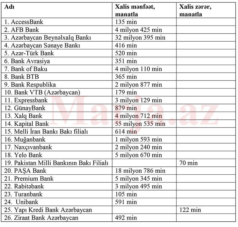“Marja”nın araşdırmasına görə, 2021-ci ilin ilk rübünü 26 bankın 24-u xalis mənfəət ilə, 2-si xalis zərər ilə başa vurub.