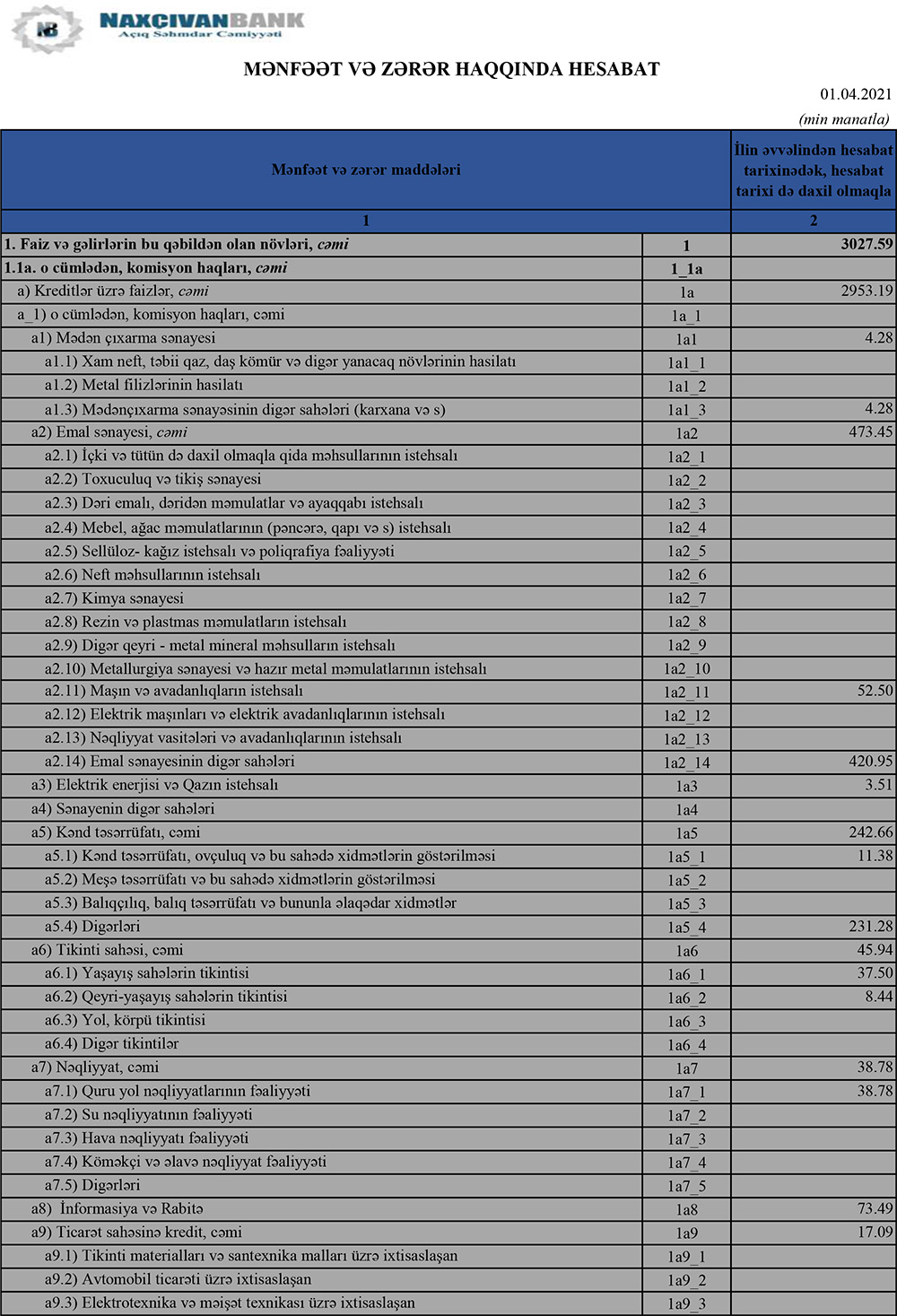 Müqayisə üçün qeyd edək ki, 2021-ci ilin yanvar-mart dövründə “Naxçıvanbank”ın cəmi əməliyyat gəlirləri 3 milyon 975 min manat, cəmi əməliyyat xərcləri 1 milyon 367 min manat, əməliyyat mənfəəti 2 milyon 608 min manat təşkil etmişdi. Bank əməliyyat mənfəətindən 430 min manat aktivlər üzrə mümkün zərərlərin ödənilməsi üçün xüsusi ehtiyatın yaradılmasına ayırmışdı.