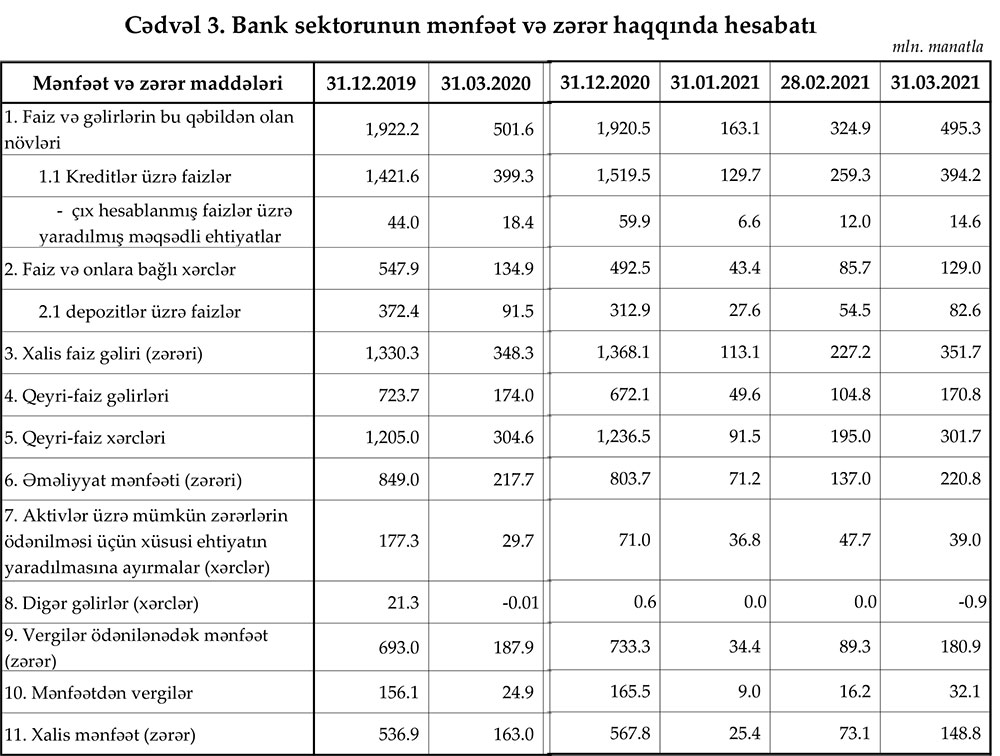 Azərbaycanın bank sektoru 2021-ci ilin ilk rübünü 148,8 milyon manat xalis mənfəət ilə bağlayıblar.
