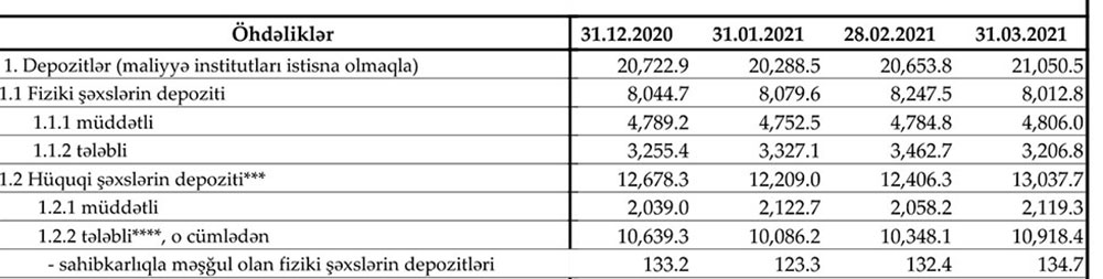Azalma fiziki şəxslərin tələbli depozitlərinin azalması ilə bağlıdır, müddətli depozitlər artıb. Belə ki, Martda tələbli depozitlər 255,9 milyon manat azalaraq 3 milyard 206,8 milyon manata düşüb, müddətli depozitlər isə 21,2 milyon manat artaraq 4 milyard 806 milyon manata çatıb.