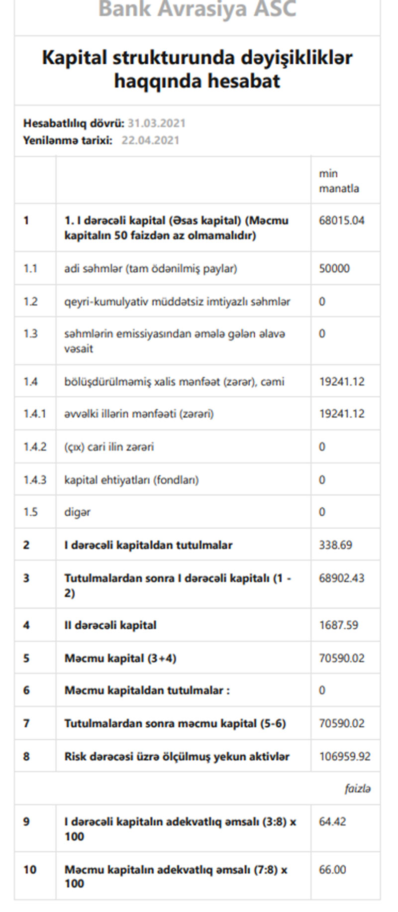 31 Mart 2021-ci il tarixində "Bank Avrasiya" 70 milyon 590 min manat məcmu kapitala malik olub.