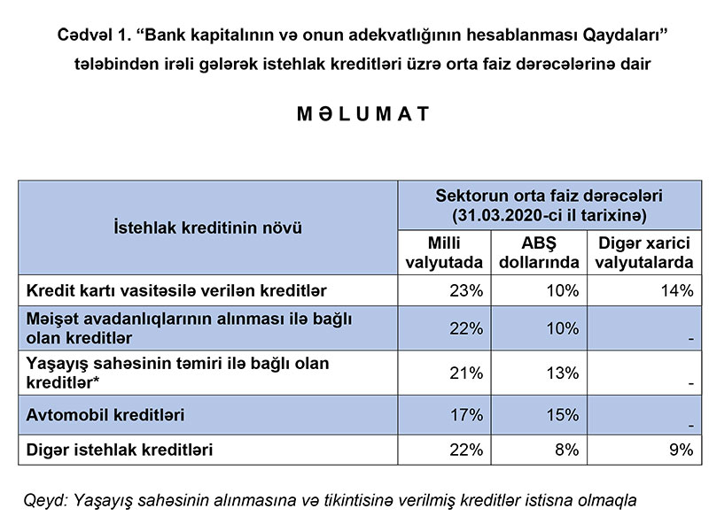 Son 1 ildə orta faiz dərəcəsi məişət avadanlıqlarının alınması ilə bağlı olan kreditlər üzrə 22%-dən 24%-ə, yaşayış sahəsinin təmiri ilə bağlı olan kreditlər üzrə 21%-dən 23%-ə, avtomobil kreditləri üzrə 17%-dən 19%-ə, digər istehlak kreditləri üzrə 22%-dən 23%-ə yüksəlib.
