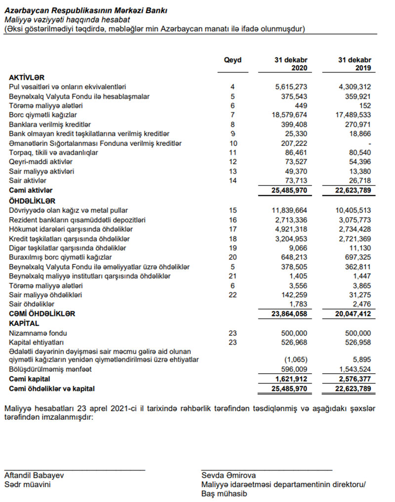 2020-ci ildə AMB-nin öhdəlikləri 19% artaraq 23 milyard 864 milyon 58 min manat, o cümlədən dövriyyədə olan əskinaslar və sikkələri 13,8% artaraq 11 milyard 839 milyon 664 min manat, rezident bankların qısamüddətli depozitləri 11,8% azalaraq 2 milyard 713 milyon 336 min manat, hökumət idarələri qarşısında öhdəlikləri 80% artaraq 4 milyard 921 milyon 318 min manat, kredit təşkilatları qarşısında öhdəlikləri 17,8% artaraq 3 milyard 204 milyon 953 milyon manat, qurumun balans kapitalı isə 37% azalaraq 1 milyard 621 milyon 912 milyon manat olub.