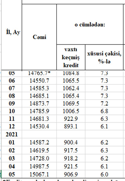 2021-ci ilin May ayının sonunda cəmi kredit qoyuluşları 15 milyard 67,1 milyon manat təşkil edib. Cəmi kredit qoyuluşlarının 6%-ni ödəmə vaxtı keçmiş kreditlər təşkil edib. Bu nisbət Aprelin sonunda 6,1%, 2020-ci ilin dekabr ayının sonunda da 6,1% idi.