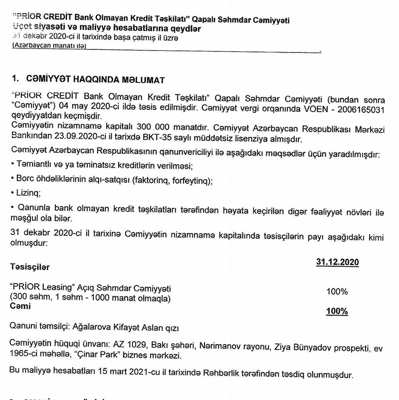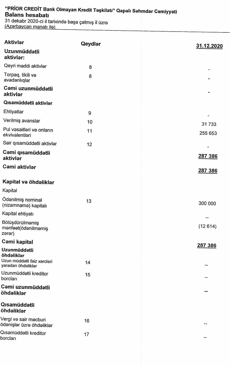 Ötən ilin sentyabr ayında lisenziya almış "Prior Credit BOKT" QSC 2020-ci il üzrə maliyyə hesabatlarını dərc edib.