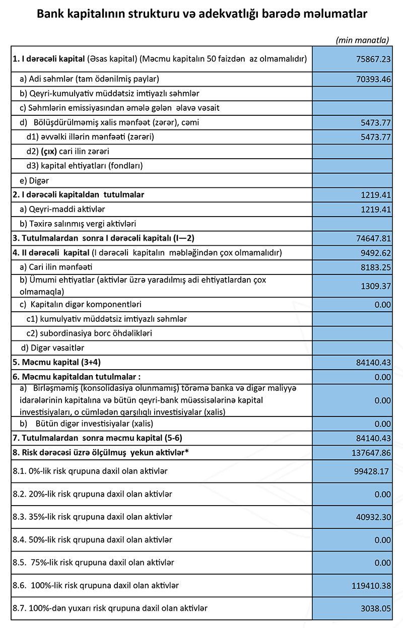 30 İyun 2021-ci il tarixində “AFB Bank” 84 milyon 140 min manat məcmu kapitala malik olub. Bank normalara artıqlaması ilə cavab verir. Belə ki, 1-ci dərəcəli kapitalın adekvatlıq əmsalı üzrə norma minimum 5% olduğu halda “AFB Bank”da fakt 54,23%, məcmu kapitalın adekvatlıq əmsalı üzrə norma minimum 10% olmasına qarşılıq Bankda fakt 61,13% olub. Bankın leverec əmsalı isə 28,18% təşkil edib (norma minimum 4%).
