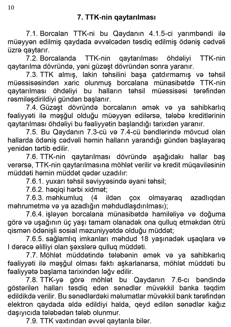 - tələbə - ona aid gəlirlərin, xərclərin, əmlakların və digər zəruri fərdi məlumatların kredit müqaviləsinin qüvvədə olduğu müddətdə aidiyyəti dövlət orqanları və təşkilatları tərəfindən Fondun və müvəkkil bankın sorğusu əsasında ona (onlara) təqdim edilməsinə və muzdla və ya mülki-hüquqi xarakterli müqavilələrlə işlədikdə və ya sahibkarlıq fəaliyyəti ilə məşğul olduqda alacağı əməkhaqqından və ya əldə edəcəyi gəlirdən TTK-nin qaytarılması məqsədilə müvəkkil bankın xeyrinə tutulmaların (gəlirin 20 faizindən çox olmamaq şərtilə) edilməsinə.