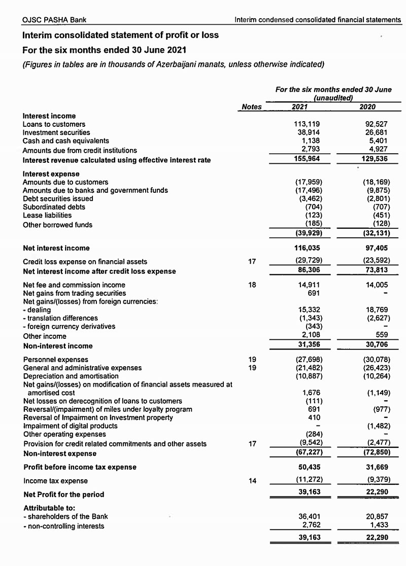 30 İyun 2021-ci il tarixinə konsolidə edilmiş müstəqil auditorların hesabatı görə, PAŞA Bank qrupu (PAŞA Bank Azərbaycan, PAŞA Bank Türkiyə və PAŞA Bank Gürcüstan) 2021-ci ilin 1-ci yarısını (yanvar-iyun dövrünü) 39 milyon 163 min manat xalis mənfəət ilə başa vurub. Bu, 2020-ci ilin eyni dövrü ilə müqayisədə 75,7% və ya 16 milyon 873 min manat çoxdur çoxdur. Qrup 2020-ci ilin ilk 6 ayını 22 milyon 290 min manat xalis mənfəət ilə bağlamışdı.