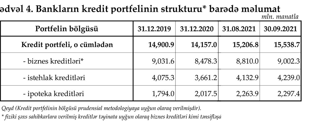 Kreditlərdə artım sürətlənib.30 sentyabr 2021-ci il tarixində Azərbaycan bankları tərəfindən müştərilərə verilmiş cəmi kreditlər 15 milyard 538,7 milyon manata çatıb.