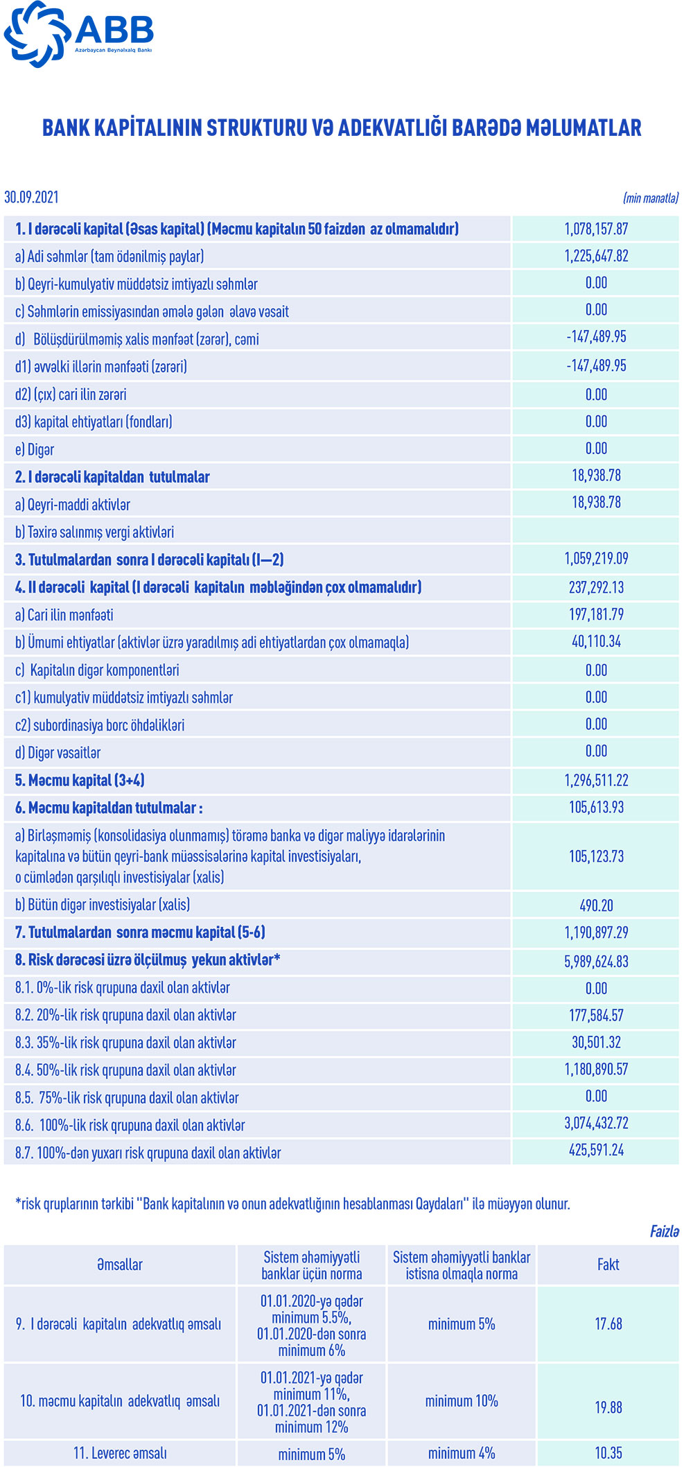 Cari ilin 9 ayının yekununda ABB-də I dərəcəli kapitalın adekvatlıq əmsalı 17.68%, məcmu kapitalın adekvatlıq əmsalı 19.88% təşkil edib. Beləliklə, Bankın kapital adekvatlığı göstəriciləri tənzimləyici orqanın müəyyən etdiyi normalardan (müvafiq olaraq 6% və 12%) əhəmiyyətli dərəcədə yüksək olub.