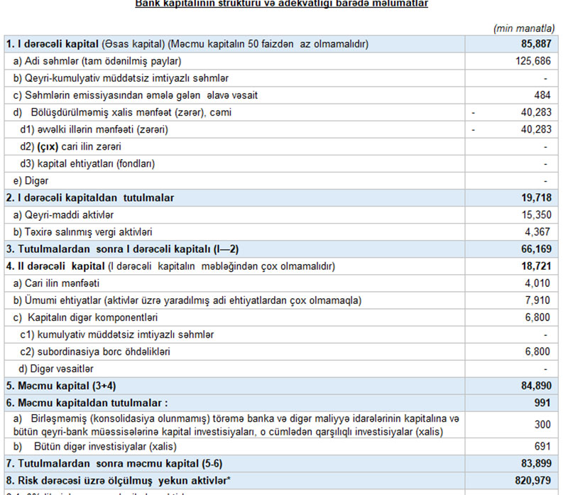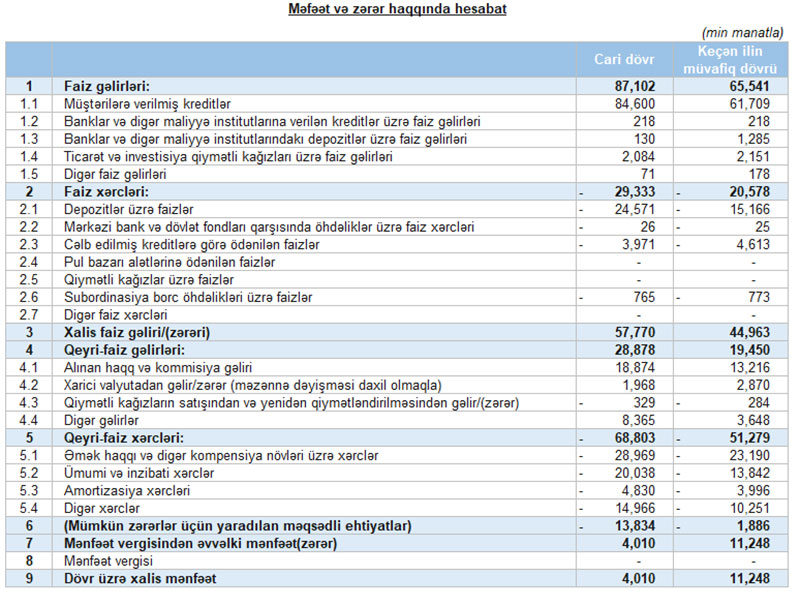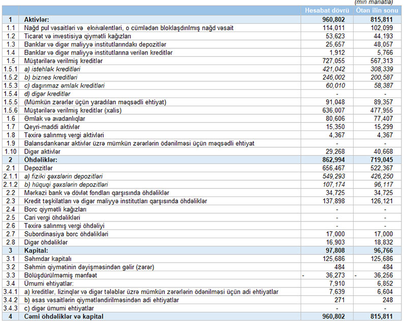 Hesabat dövrünün sonuna bankın balans kapitalı 98 milyon manata çatıb, xalis mənfəəti isə 4 milyon manat təşkil edib.