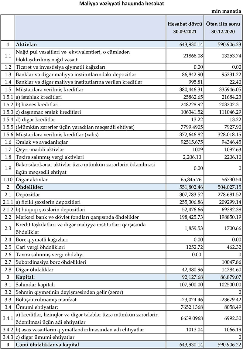 "Muğanbank"ın cəmi aktivləri 2021-ci ilin 9 ayında ötən ilin sonu ilə müqayisədə 53 milyon 24 min manat və ya 9% artaraq 643 milyon 930 min manata yüksəlib. Bank 2020-ci ilin sonunda 590 milyon 906 min manat cəmi aktivlərə malik idi.
