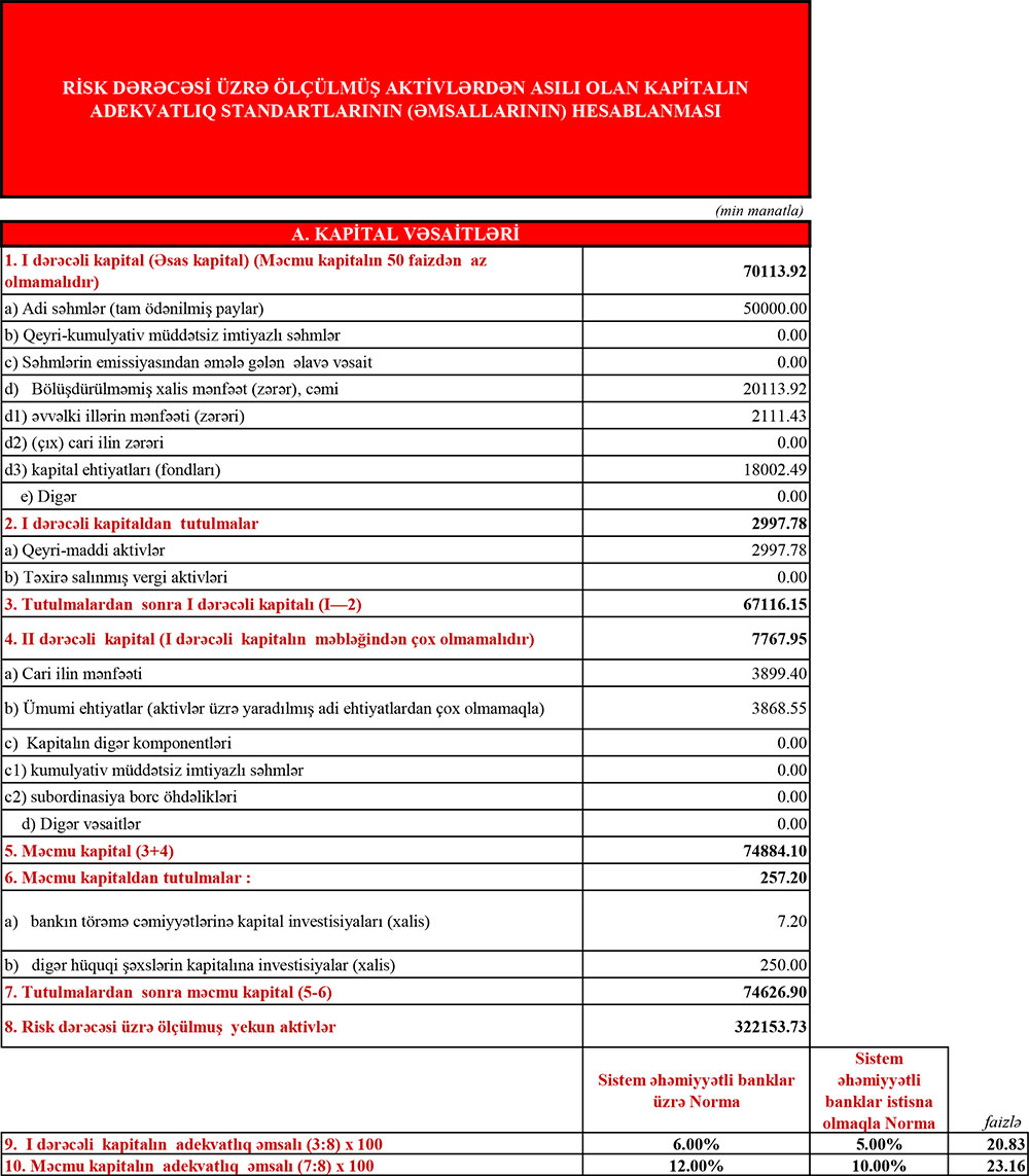 Xatırladaq ki, 2020-ci ilin 9 ayında “Ziraat Bank Azərbaycan”ın cəmi əməliyyat gəlirləri (faiz və qeyri-faiz xərcləri) 17 milyon 342 min manat, cəmi əməliyyat xərcləri (faiz və qeyri-faiz xərcləri) 11 milyon 660 min manat, faiz borcları üzrə yaradılmış məqsədli ehtiyatlar 1 milyon 207 min manat, gəlirlər xərcləri üstələdiyindən əməliyyat mənfəəti 4 milyon 475 min manat təşkil etmişdi. Bank əməliyyat mənfəətindən 2 milyon 232 min manat aktivlər üzrə mümkün zərərlərin ödənilməsi üçün xüsusi ehtiyatın yaradılmasına ayırmış, 303 min manat mənfəət vergisi ödəmişdi. Nəticədə, "Ziraat Bank Azərbaycan" ASC həmin dövrü 1 milyon 940 min manat xalis mənfəət ilə bağlamışdı.