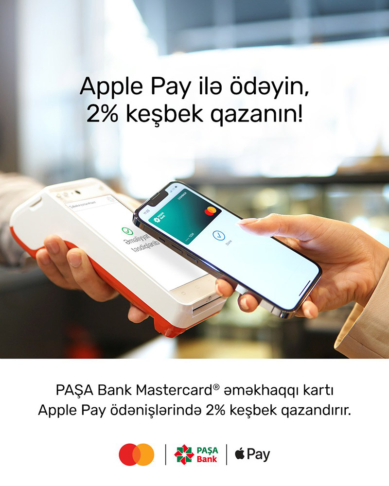 “Apple Pay” ödənişlərinizi yeni mobil tətbiqimizdən “PAŞA Bank” “Mastercard” əməkhaqqı keşbek kartınızla edin, 2% keşbek qazanın!