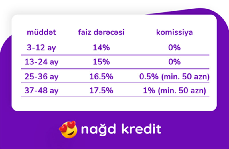 Kampaniya ərzində 3 aydan 12 ay müddətinədək rəsmiləşdirilən kreditlərin illik faiz dərəcəsi 14%-dir.