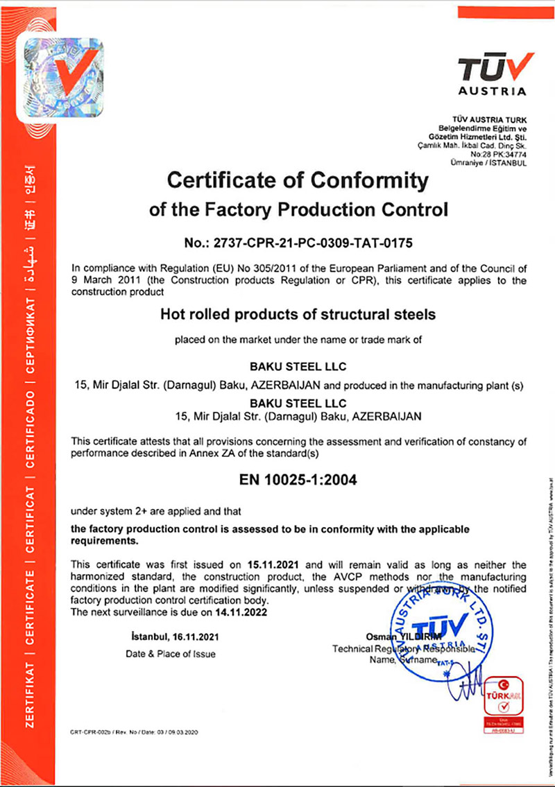 (®) Polad istehsalında Avropa və Amerikanın keyfiyyət sertifikatları Azərbaycanda yalnız “Baku Steel Company”yə təqdim edilib.