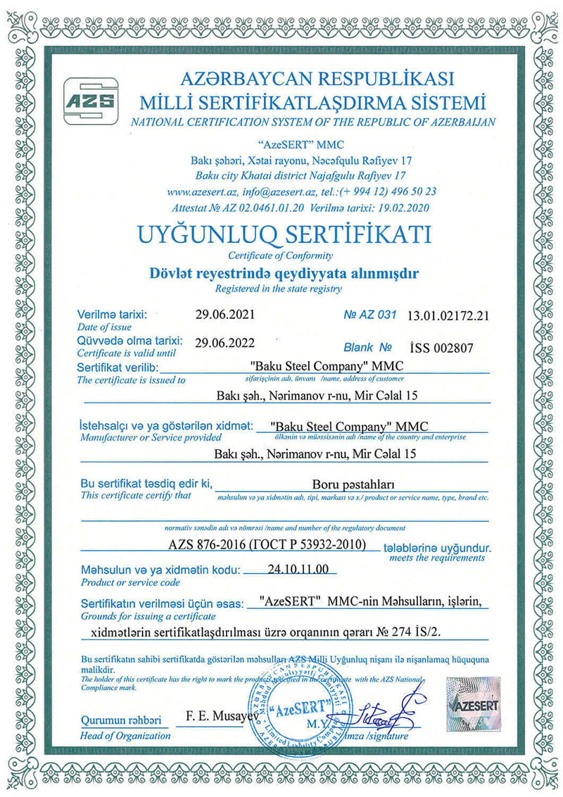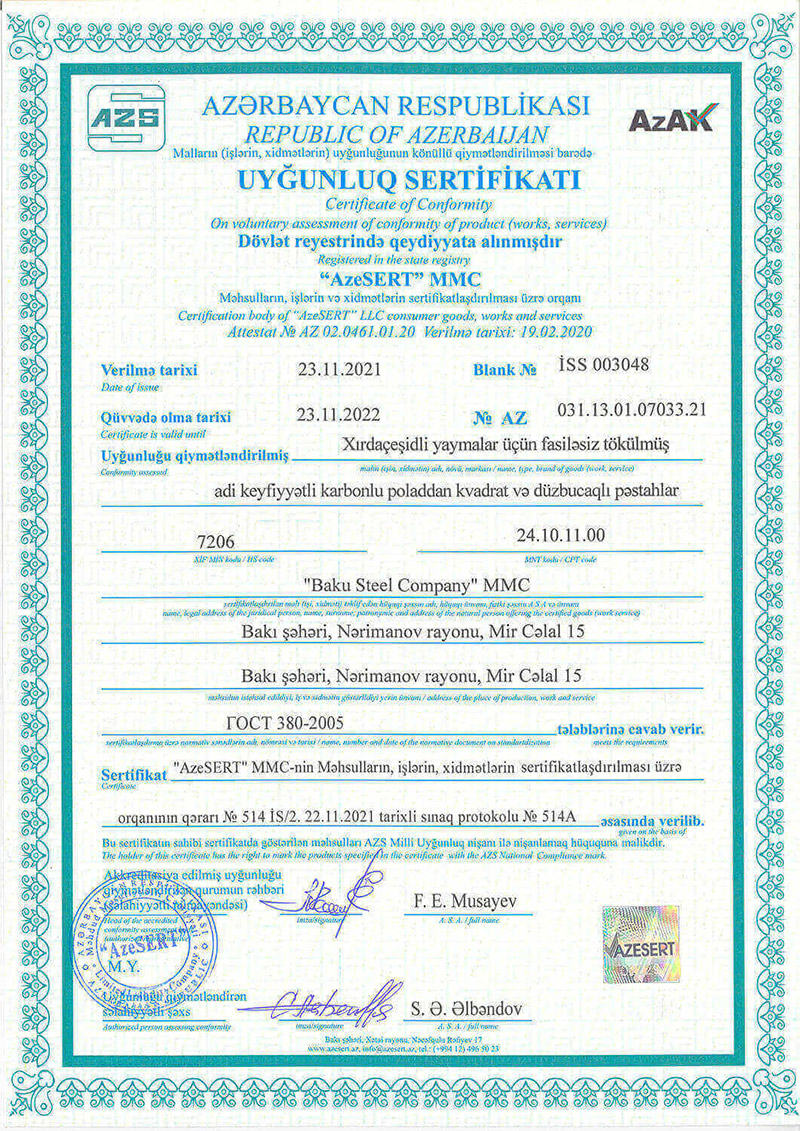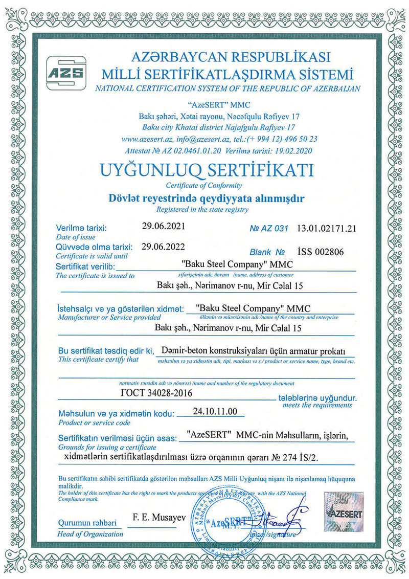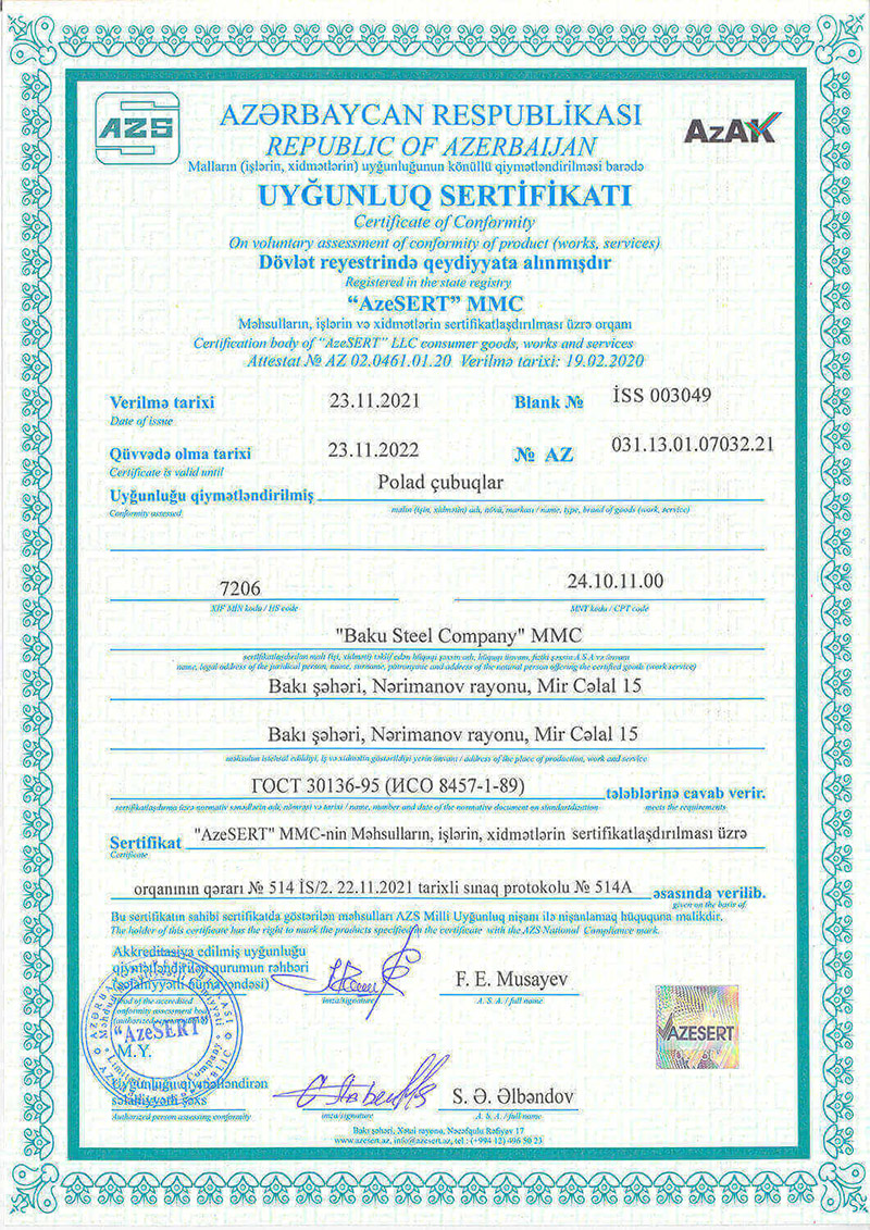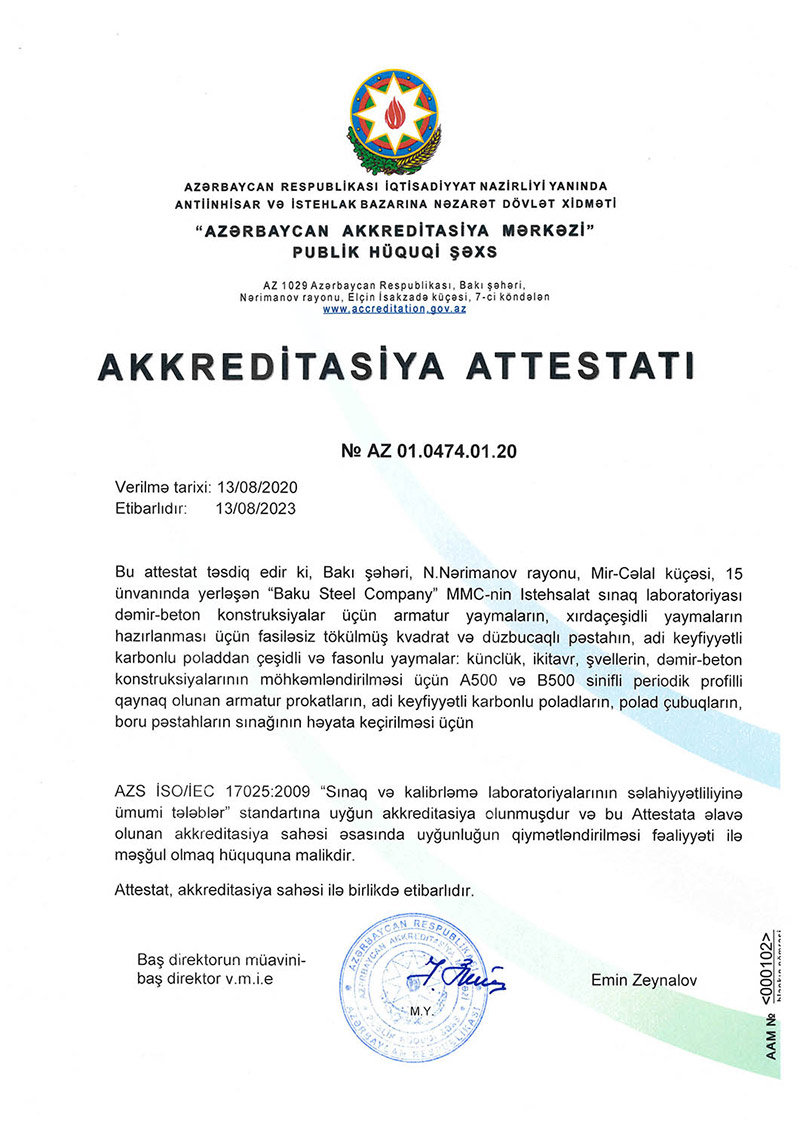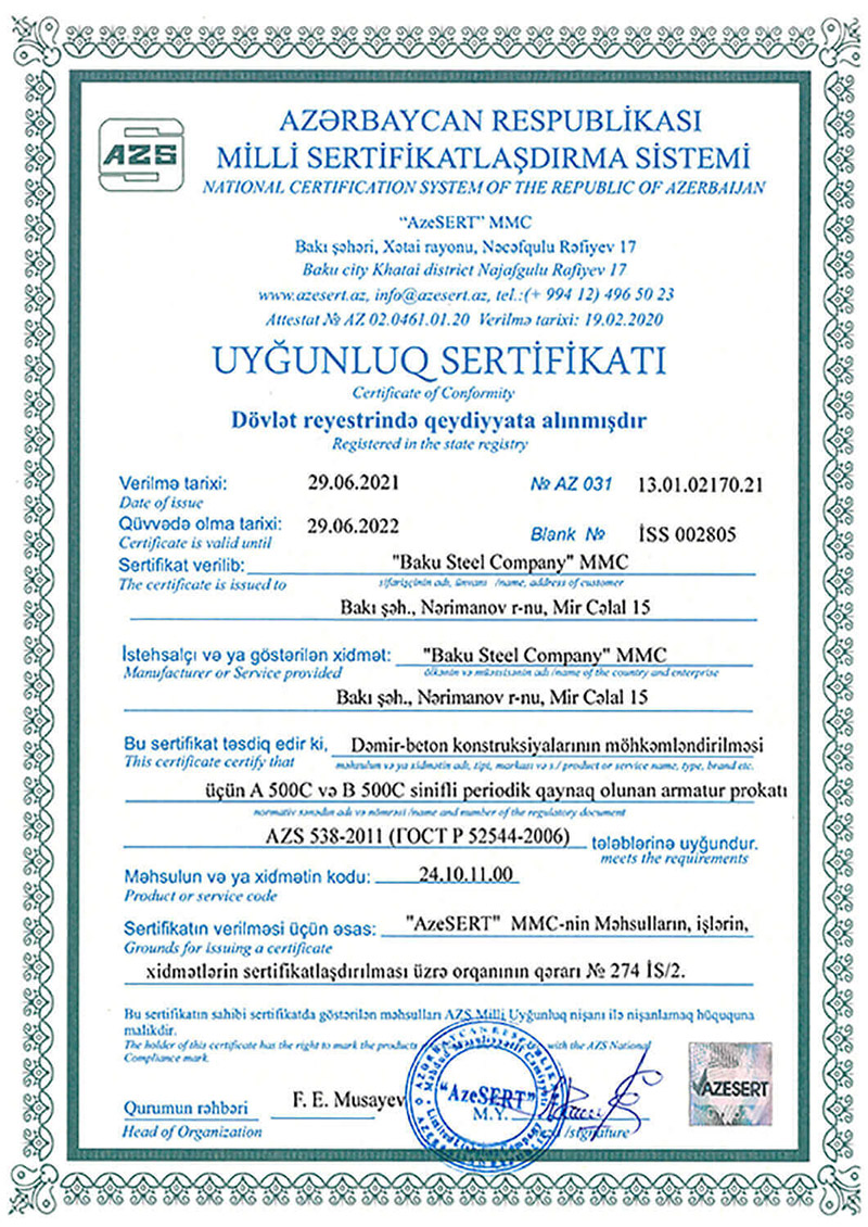 Bir neçə gün əvvəl “Baku Steel Company”yə armatur, kvadrat və dairəvi pəstahların istehsalı keyfiyyətini təsdiq edən EN 10080:2005, EN 10025-1:2004 də DIN 17100:1980, bir neçə ay öncə isə ASTM A615/A615M-20, ASTM A706/ A706M-16, həmçinin boruların keyfiyyətinə görə EN 10210-1:2006 və ГОСT 31446-2017 beynəlxalq sertifikatları (https://www.bakusteel.com/az/biz-kimik/sertifikatlar/ ) təqdim olunub.