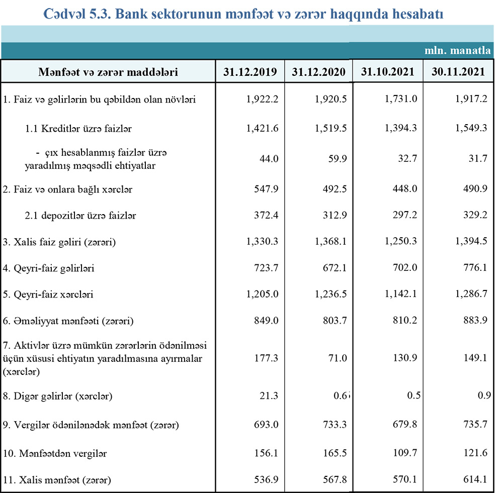 2021-ci il üzrə bank icmalı30 noyabr 2021-ci il tarixinə olan bank sektorunun əsas göstəriciləri açıqlanıb.