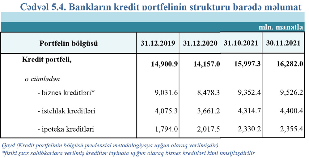 Bank sektorunun 35 milyard 604,5 milyon manatlıq cəmi aktivlərinin 16 milyard 282 milyon manatı müştırilərə verilmiş kreditlərdən, 4 milyard 754,6 milyon manatı qiymətli kağızlara investisiyalardan ibarət olub. Noyabrda müştərilərə verilmiş cəmi kreditlər 284,7 milyon manat, ötən ilin sonu ilə müqayisədə (11 ayda) isə 2 milyard 125 milyon manat artıb.