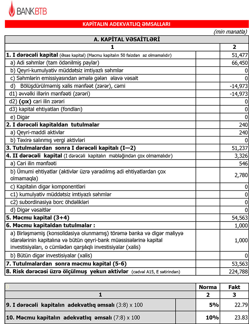 Bankın əsas dayanıqlıq göstəricilərindən olan məcmu kapitalın adekvatlıq əmsalı 23.73% təşkil edir ki, bu da təyin olunmuş normadan (10%-dən) təxmini 2 dəfəyədək yüksəkdir. Müvafiq dövr ərzində I dərəcəli kapitalın adekvatlıq əmsalı artaraq 22.69 %-ə çatmışdır. Qeyd edək ki, bu göstəricilər yerli qanunvericiliyin minimal tələbindən (5%-dən) 4 dəfəyədək daha dayanıqlıdır.