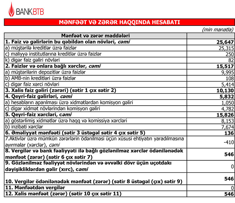 Bankın yaydığı press-relizdə bildirilir ki, Bankın xalis mənfəəti 546 min manat təşkil edib.