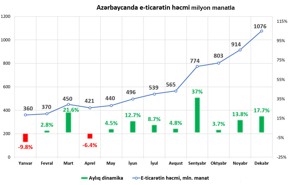Ötən ilin dekabr ayında Azərbaycan əhalisi tərəfindən bank kartları ilə elektron ticarət (e-ticarət) şəbəkəsində 1 milyard 76 milyon manat həcmində ödəniş həyata keçirilib. Bu, indiyədək qeydə alınan ən yüksək aylıq göstəricidir. Bundan əvvəlki rekord ötən ilin noyabrında qeydə alınıb – 914 milyon manat.