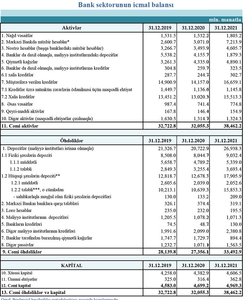 31 dekabr 2021-ci il tarixinə fəaliyyətdə olan bankların cəmi aktivləri 38 milyard 462.2 milyon manat, cəmi öhdəlikləri 33 milyard 492.9 milyon manat, balans kapitalı 4 milyard 969.3 milyon manat olmuşdur.