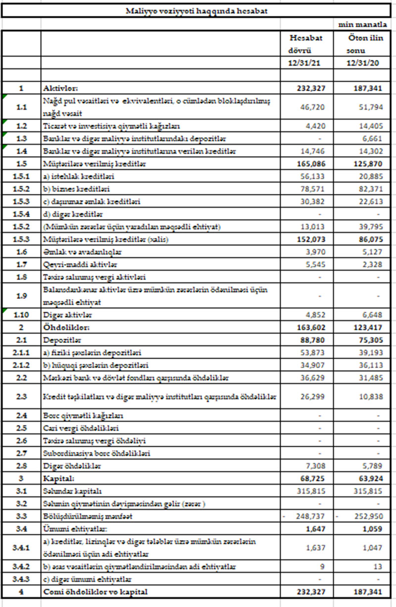 “Bank VTB (Azərbaycan)” ASC 2021-ci il üzrə maliyyə göstəricilərini açıqlayıb.