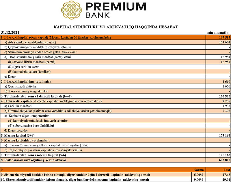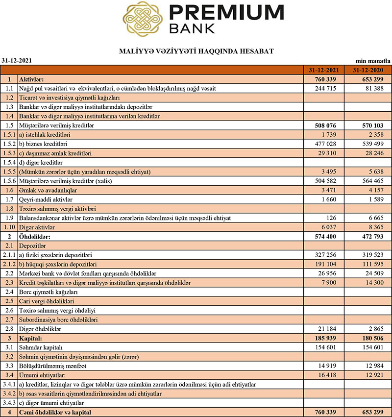 “Premium Bank” ASC 2021-ci il üzrə maliyyə göstəricilərini açıqlayıb.
